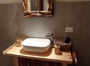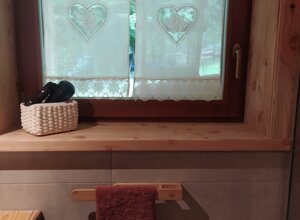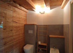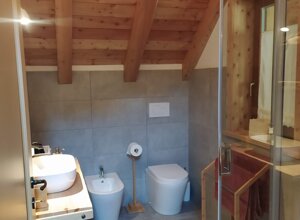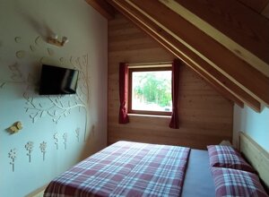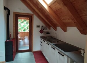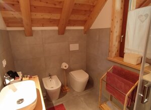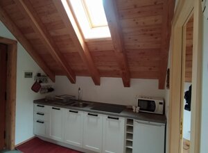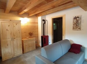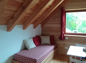 Salendo una scala in larice si accede al primo piano dove troviamo un terrazzino d’ ingresso con tavolino per la colazione, un angolo cottura attrezzato, un bagno completo con doccia, una camera matrimoniale e una cameretta/salottino.(foto)